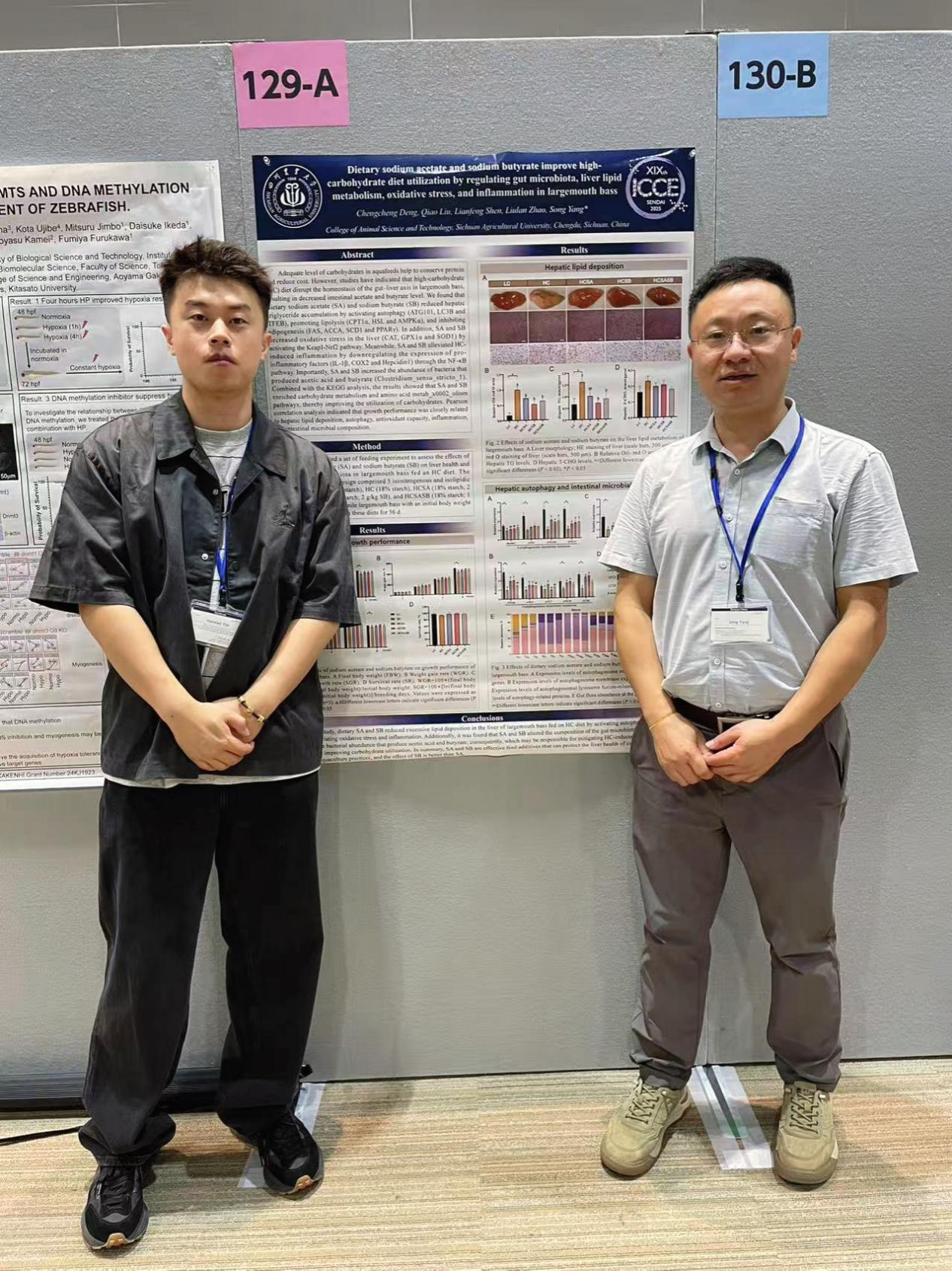 会议期间,杨淞教授与博士研究生颜浩骁分别在相关分会场作口头学术报告。杨淞教授报告了其团队在鱼类脂质代谢调控方面的最新发现,乙酸钠和丁酸钠可通过抑制肠道脂肪生成并促进脂肪代谢,有效改善鱼类肠道脂肪沉积。博士研究生颜浩骁分享了关于促红细胞生成素(Epo)调控鱼类低氧耐受能力的新机制研究。