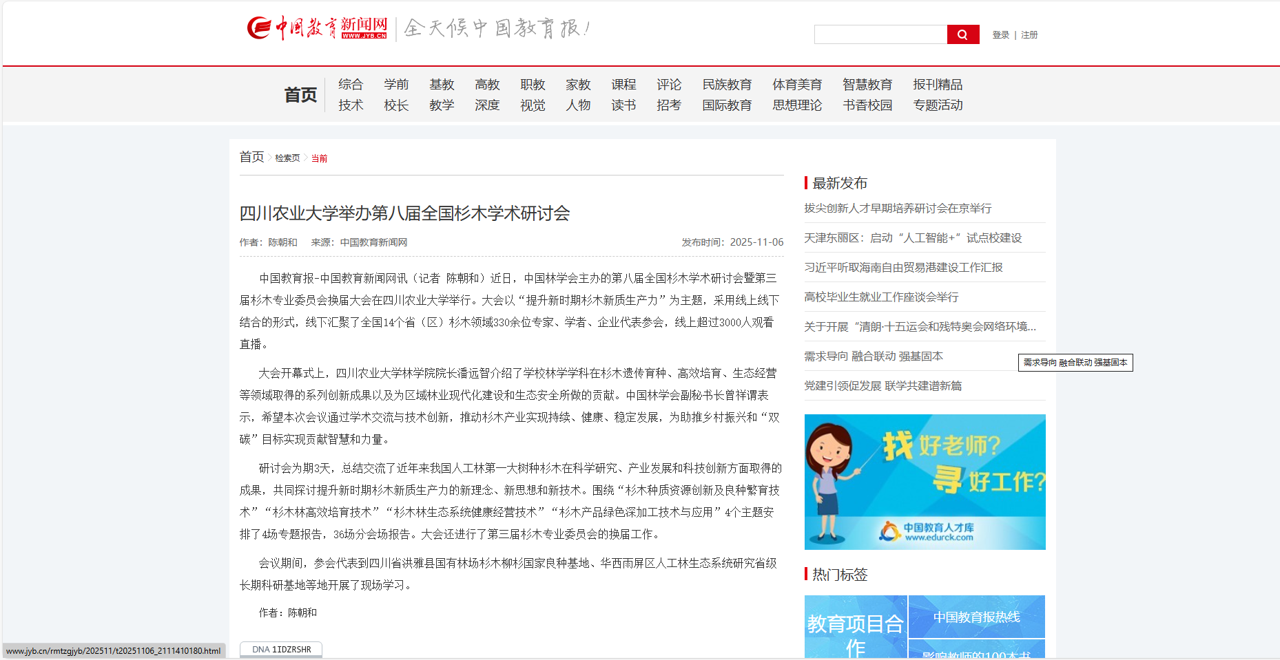 中国教育报-中国教育新闻网讯(记者 陈朝和)近日,中国林学会主办的第八届全国杉木学术研讨会暨第三届杉木专业委员会换届大会在四川农业大学举行。大会以“提升新时期杉木新质生产力”为主题,采用线上线下结合的形式,线下汇聚了全国14个省(区)杉木领域330余位专家、学者、企业代表参会,线上超过3000人观看直播。