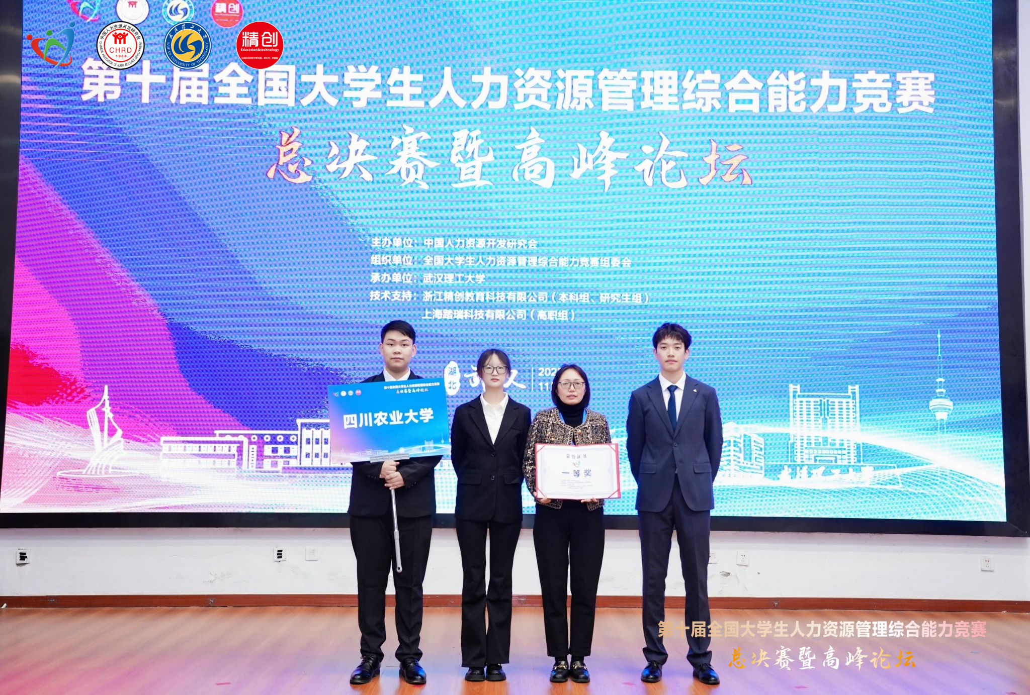 11月7-9日,第十届全国大学生人力资源管理综合能力竞赛总决赛在武汉理工大学举行,公共管理学院人力资源管理专业本科生蒋朝巍、石静燃、梁熙渝组队参赛,在陈娟、刘科两位老师的指导下表现出色,荣获全国一等奖。大赛由中国人力资源开发研究会主办,武汉理工大学承办。本届大赛的区域赛在全国7大赛区举办,共有600多所高校逾1500支队伍参赛,仅西南赛区就吸引到西南财经大学、四川农业大学、云南大学、西南政法大学等40余所开办人力资源管理本科专业的高校200余支队伍参加。