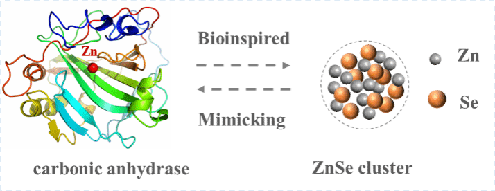 在仿生催化领域,纳米酶因其高稳定性、低成本和易于改性等优点,被视为天然酶的理想替代品。然而,目前约93%的纳米酶研究集中在模拟氧化还原酶(如过氧化物酶和氧化酶),而对水解纳米酶的开发相对匮乏。天然碳酸酐酶是一种典型的水解酶,其活性中心由三个组氨酸残基配位的锌离子组成。课题组通过模拟其结构,探索了具有精确原子组成且表面暴露大量锌位点的ZnSe魔术尺寸簇及其预成核簇的催化潜力。